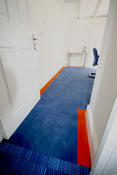 After several meetings at the Rudge Brothers and James design studio in Victoria Road and visiting a number of installations carried out by RBJ, Julian Cook of Burston Cook took Jim Heal's advise and installed Milliken Essentials a cushion backed blue and red carpet tile for their updated offices.